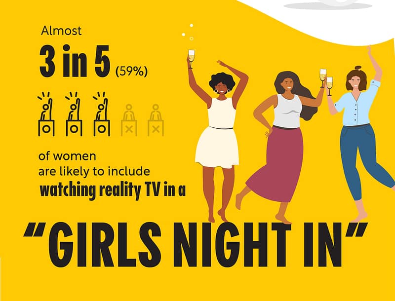 inducing reality television?? Watching it with your besties of course! In fact, “59% of respondents said they’re likely to include watching Reality TV on a “girls night in.”’ Chips, sweet treats, and popcorn were some other watch night essentials.